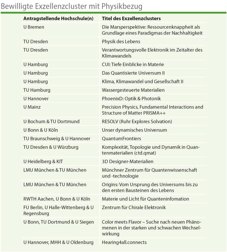 Im Gegenzug gibt es sechs Exzellenzcluster mit Physikbezug, die neu eine Förderung erhalten, nämlich „Die Marsperspektive“ an der Universität Bremen, „Verantwortungsvolle Elektronik im Zeitalter des Klimawandels“ an der TU Dresden, „Wassergesteuerte Materialien“ an der TU Hamburg, „Unser dynamisches Universum“ an den Universitäten in Bonn und Köln, „Zentrum für Chirale Elektronik“ an der FU Berlin sowie den Universitäten Halle-Wittenberg und Regensburg und zu guter Letzt „Color meets Flavor“ an den Universitäten Bonn und Siegen sowie der TU Dortmund.