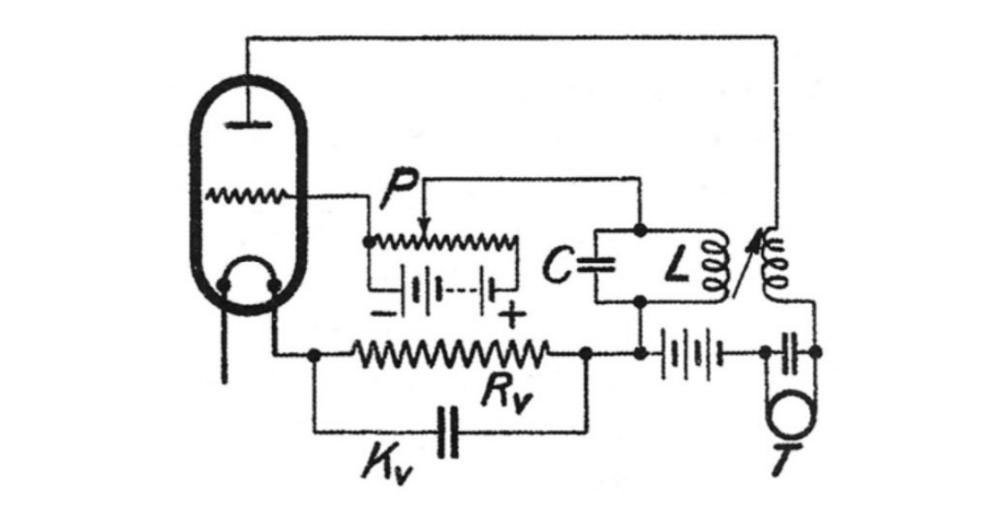 Die Abbildung zeigt die Grundschaltung des ersten Trautoniums. Die Frequenz des Schwingkreises CL wird durch den variablen Widerstand P modifiziert und ist Taktgeber für die im Thyratron erzeugte Kippschwingung. Diese wird letztlich über T zu einem Lautsprecher geführt. Der Widerstand P ist ein von einem Widerstandsdraht umwickelter, gespannter Draht. Durch Drücken kann ein Kontakt an unterschiedlichen Stellen hergestellt werden, womit sich eine stufenlos variable Tonhöhe ergibt. Die Elemente RV und KV dienen der Unterdrückung von Störungen.