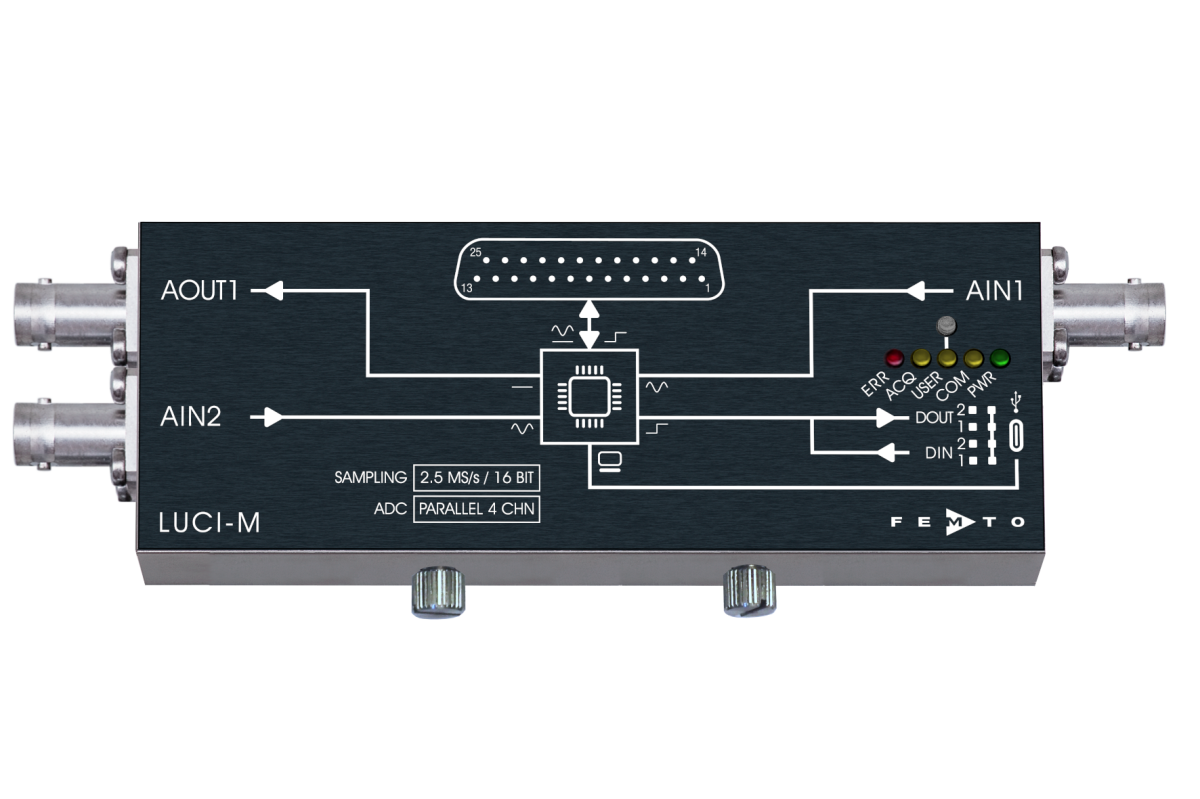 Merkmale: 16-Bit-ADCs digitalisieren die Messwerte mit einer Bandbreite von bis zu 1,1 MHz. Je nach Modell stehen zwei oder vier synchron erfassende ADCs für die Mehrkanal-Signalmessung mit präziser zeitlicher Zuordnung zur Verfügung. Drei 12-Bit DACs steuern externe Geräte oder dienen als Bias-Spannungsquelle. 24 digitale I/Os lesen Status- und Alarmsignale und schalten externe Peripherie. LUCI-M kann fest mit FEMTO-Geräten mit D-Sub-25-Anschluss, etwa dem DLPCA-200, verbunden werden. So fügen sich LUCI-M und Verstärker/Fotodetektor zu einem kompakten Gerät zusammen.